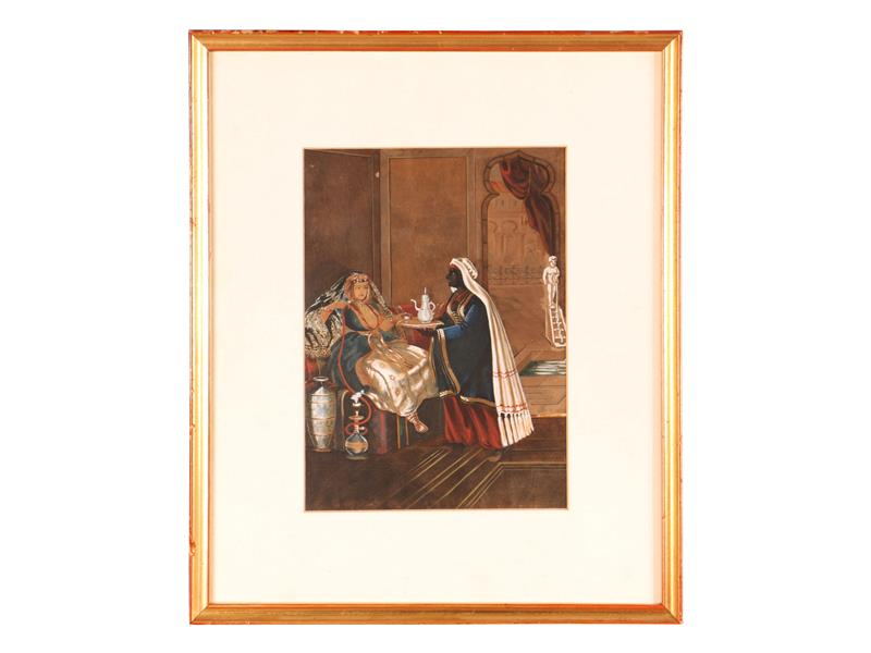NARGİLE İÇEN KADIN. KAĞIT ÜZERİ KARIŞIK TEKNİK. İMZASIZ. 28X20 CM.