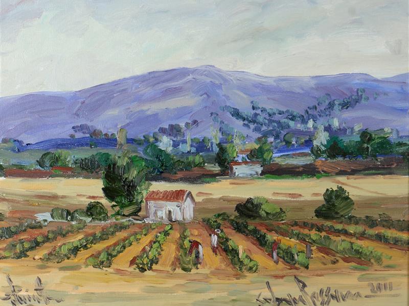 BAHÇEDE ÇALIŞANLAR. TUAL ÜZERİ YAĞLIBOYA. ÇOBAN RESSAM İMZALI. 2011 T. 40X50 CM.