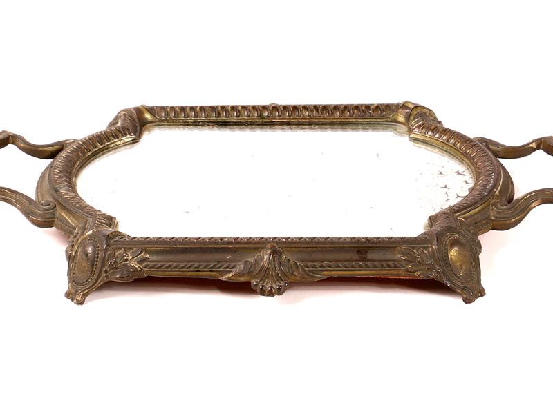 DİKDÖRTGEN FORMLU. ÇİFT TUTAMAKLI VE KABARTMA DESENLERLE DEKORLU. TEPSİ İÇİ ORİJİNAL AYNALI. 43X26 CM.