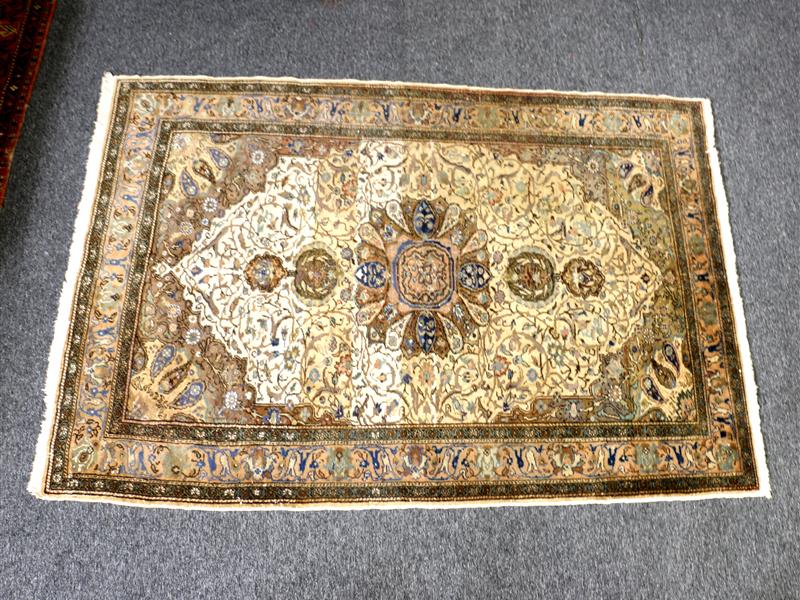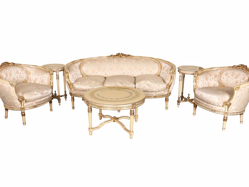 1 ADET KANEPE, 2 ADET KOLTUK VE 3 ADET SEHPA. AHŞAP LAKE ÜZERİ ALTIN YALDIZLA DEKORLANMIŞ KOLTUK VE KANEPELERİN ÜZERLERİ SATEN KUMAŞ KAPLI. LAKE ÜZERİ ALTIN YALDIZLA DEKORLU SEHPANIN TABLA ÜZERLERİ MOTİFLERLE SÜSLÜ. H 65 CM. ÇAP 44 CM. H 38 CM. ÇAP 80 CM.