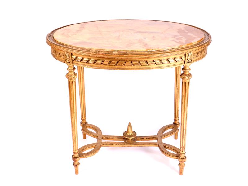 FRANSIZ. OVAL FORMLU. 4 AYAK ORTADAN BAĞLANTILI. KABARTMA VE OYMA İŞÇİLİKLİ. GÜL KURUSU MERMER TABLALI. 88X75X62 CM.