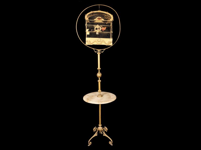 BRONZ AYAK ÜZERİ KUŞ KAFESİ MONTELİ. ORTA KISMI YUVARLAK MERMER TABLALI. H 205 CM. ÇAP 50 CM.
