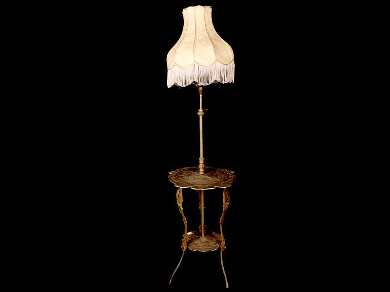 ART NOUVEAU TARZI. HER İKİ TABLA GÖLDE KUĞU PEYZAJLI. KAZIMA İŞÇİLİKLİ. TEK LAMBALI. YÜKSEKLİK AYARLANABİLİR. SANATÇI İMZALI. H 180 CM. ÇAP 44-30 CM.