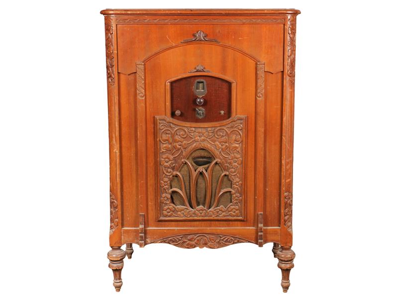 AMERİKAN. E.H.SCOTT RADİO. PKAP VE RADYOLU MÜZİK DOLABI. KABARTMA İŞÇİLİKLİ. YUKARI DOĞRU AÇILIR TABLALI. 82,5X124,5X50 CM.