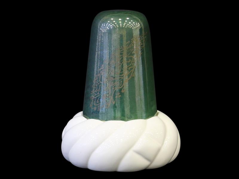 SERAMİK MEVLEVİ DESTAR-I ŞERİF FORMLU. KOYU YEŞİL SİKKE ÜZERİNDE HAT SANATINDAN BİR ÖRNEK YAZILI. H 37 CM. ÇAP 30 CM.