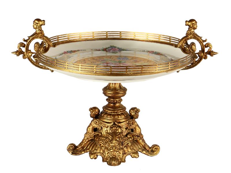 FRANSIZ. LİMOGES İMALAT DAMGALI. ÇİFT EROS FİGÜRLÜ. KIVRIK AYAKLI BRONZ KAİDE ÜZERİNDE FİGÜR BAŞLI ÇİFT TUTAMAKLAR YUVARLAK FORMLU KORUMA İLE MONTELENEN PORSELENİN ÜZERİ EL YAPIMI ÇOK RENKLİ ÇİÇEKLERLE DEKORLU. DÜNYACA ÜNLÜ ANTİKA LİMOGES DEKORLARINDAN ESİNLENİLMİŞTİR. ÇAP 44 CM. H 31 CM.