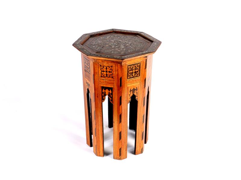 IHLAMUR AĞACINDAN MAMUL. SEKİZ İÇ BÜKEY AYAK ÜZERİNDE SEKİZGEN GÖVDE ÜZERİ MARKÖTERİ ÇALIŞMALI. TABLA ÜZERİ SEDEF KAKMALI VE GEOMETRİK MOTİFLERLE DEKORLU. ORTADA YAZI HALİYLE. 35X35 CM. H 49 CM.
