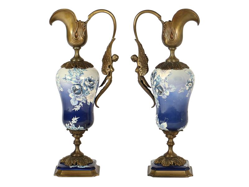 YUKARI DOĞRU UZAYAN ŞİŞKİN GÖVDELİ. KOBALT DEGRADE RENKLİ ÜZERİ GÜL MOTİFLERİYLE BEZELİ. KARE FORMLU PORSELENE MONTELİ BRONZ KAİDE ÜZERİNDE BRONZ GAGA AĞIZ ARKASINDAN İNEN ZARİF BİR TİJ MELEK HEYKELİ FORMUNDAKİ SAPLA BÜTÜNLEŞMİŞ. H 68 CM. NADİR BULUNAN ESERLERDEN BİRİDİR.
