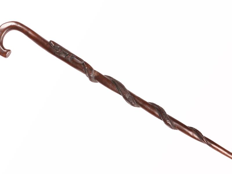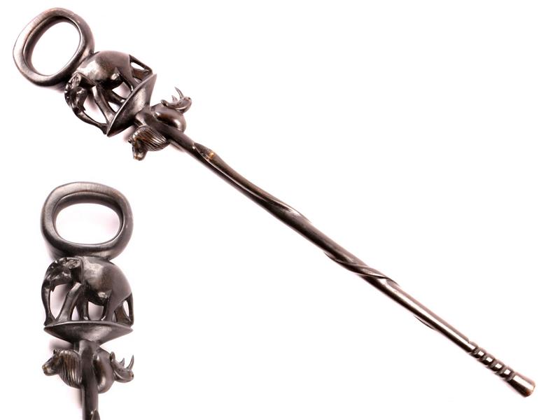 20. YY. AFRİKA ETNİK SANATI. KAZIMA VE OYMA İŞÇİLİKLİ. ABANOZDAN MAMÜL. TUTAMAK KISMI YILAN, GERGEDAN, ASLAN VE FİL FİGÜRLÜ. UZ 95 CM.