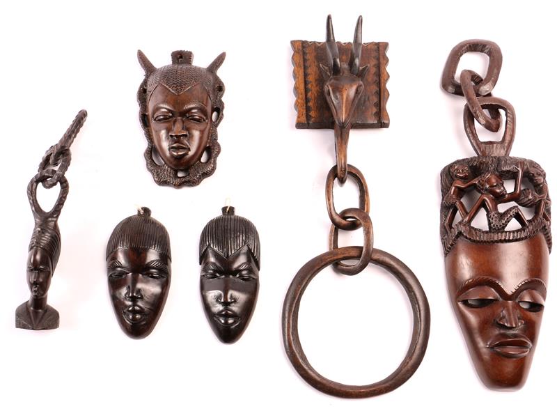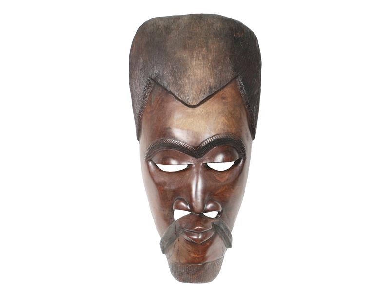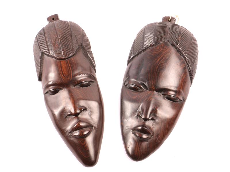 20. YY. AFRİKA ETNİK SANATI. KAZIMA VE OYMA İŞÇİLİKLİ. 1 ADET KADIN BÜSTÜ. H 28 CM. 4 ADET MASKE H 17-44 CM. AHŞAP OYMA GEYİK BAŞI FİGÜRÜ. H 43 CM.