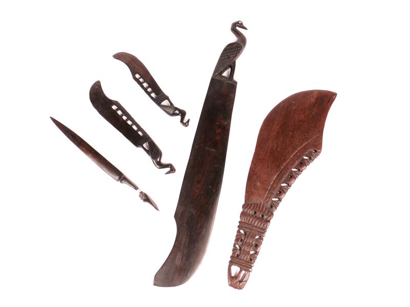 20. YY. AFRİKA ETNİK SANATI. KAZIMA VE OYMA İŞÇİLİKLİ. 2 BÜYÜK, 3 KÜÇÜK PALA. BÜYÜK BOY PALALARDAN BİRİ ABANOZDAN MAMÜL. SAP KISIMLARI MUHTELİF FİGÜRLER İLE DEKORLU. UZ 25-61 CM.