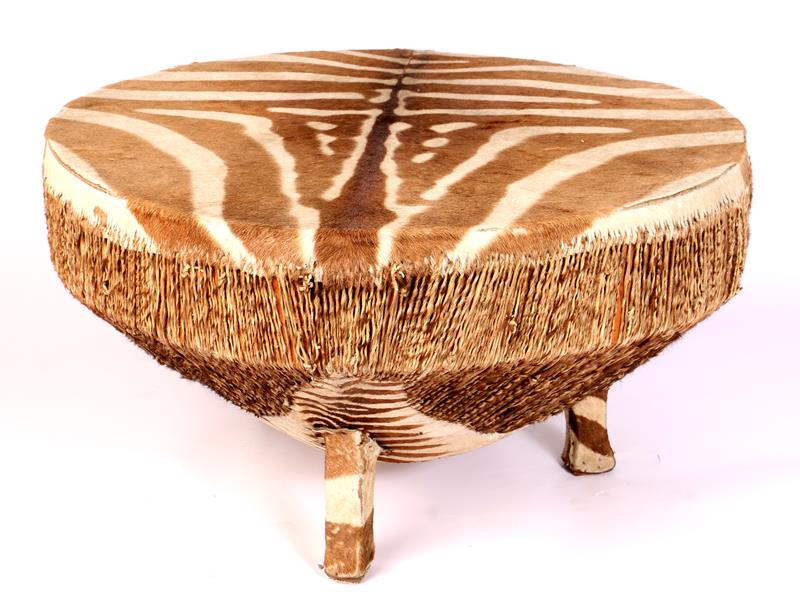20 YY. AHŞAP VE ZEBRA POSTUNDAN MAMÜL. YAN ÖRGÜLERİ DERİ. ÇAP 90 CM. H 50 CM