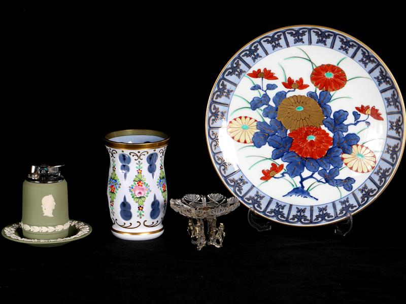 SERAMİK TABAK VE ÇAKMAK İNGİLİZ. WEDGWOOD. İMALAT DAMGALI. ÇAKMAK H 10 CM. BOHEM VAZO. ALTIN YALDIZ VE ÇİÇEKLERLE EL DEKORLU. H 13 CM. ÇAP 8.5 CM. GÜMÜŞ KAPLAMA MİNİK ŞEKERLİK. 1 ADET DUVAR TABAĞI. TABAK İÇİ RENKLİ ÇİÇEKLERLE EL DEKORLU. ÇAP 25 CM.