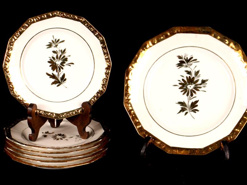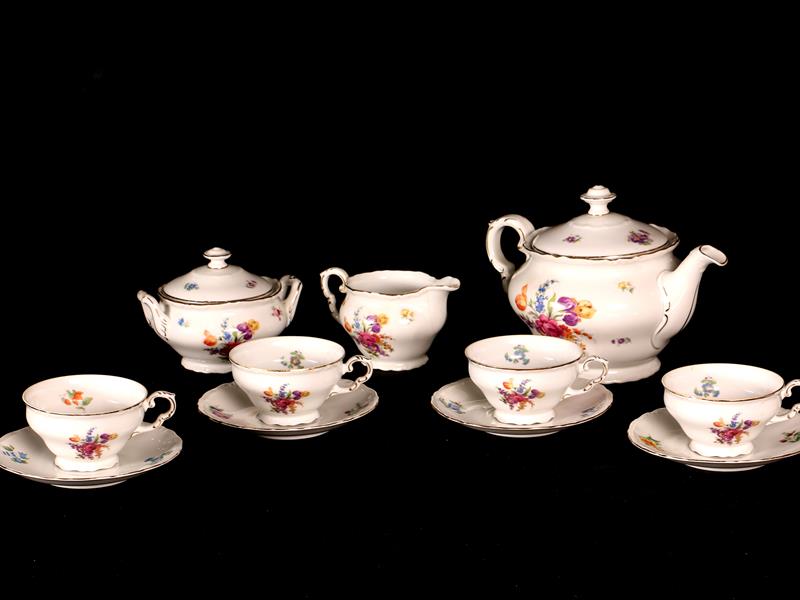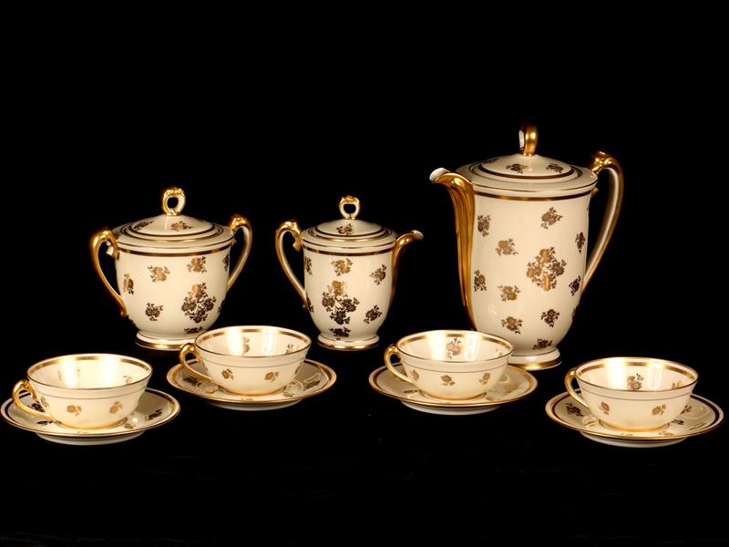 FRANSIZ. 1925. MARCEL CHABROL LİMOGES İMZALI. ALTIN YALDIZ, ÇİÇEKLERLE EL DEKORLU. 4 ADET FİNCAN, 4 ADET TABAK, DEMLİK, SÜTLÜK VE ŞEKERLİK. 1925 PARİS DEKORATİF SANATLAR SERGİSİNDE BÜYÜK ÖDÜLÜ KAZANMIŞTIR.