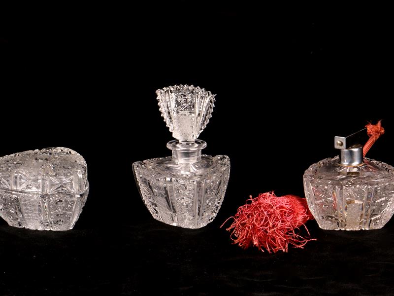 FRANSIZ. KESME KRİSTAL. 2 ADET PARFÜM ŞİŞESİ VE PUDRALIK.
