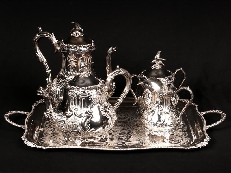 İNGİLİZ. İMALAT DAMGALI. 2 ADET DEMLİK, SÜTLÜK VE ŞEKERLİK. TÜM GÖVDE KABARTMA MOTİFLERLE DEKORLU. KAPAK TUTAMAKLARI KUŞ APLİKELİ. H 13-26 CM. İNGİLİZ. SHEFFİELD. İMALAT DAMGALI TEPSİ. DİKDÖRTGEN FORMLU KALEM İŞÇİLİKLİ. TEPSİ KENAR KÖŞELERİ KABARTMA ÇİÇEKLERLE DEKORLU. ÇİFT TUTAMAKLI. 56X35 CM.