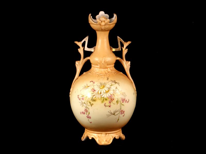 AVUSTURYA İMALAT DAMGALI. ÇİFT TUTAMAKLI, ŞİŞKİN GÖVDE ÜZERİ RENKLİ ÇİÇEKLERLE DEKORLU. H 36,5 CM.
