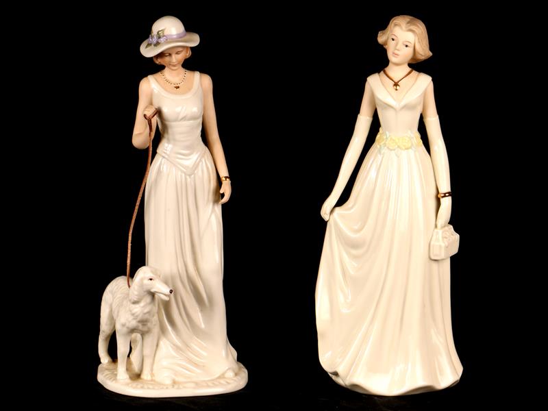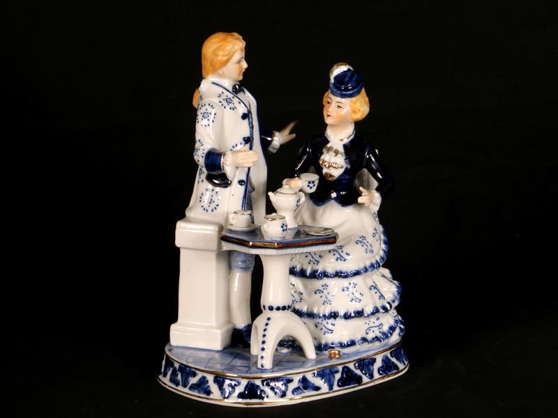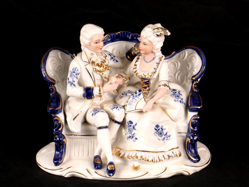 İMALAT DAMGALI. İKİLİ FİGÜR. BEYAZ HAMUR ÜZERİ KOBALT RENKLE VE ALTIN YALDIZLA DEKORLU. 20X14X14,5 CM.