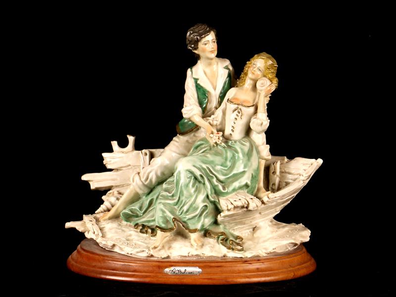 İTALYA. A.BELCARİ İMZALI. 1983 T. SANDALDA OTURAN İKİLİ FİGÜR. H 22,5X18 CM.
