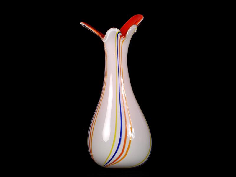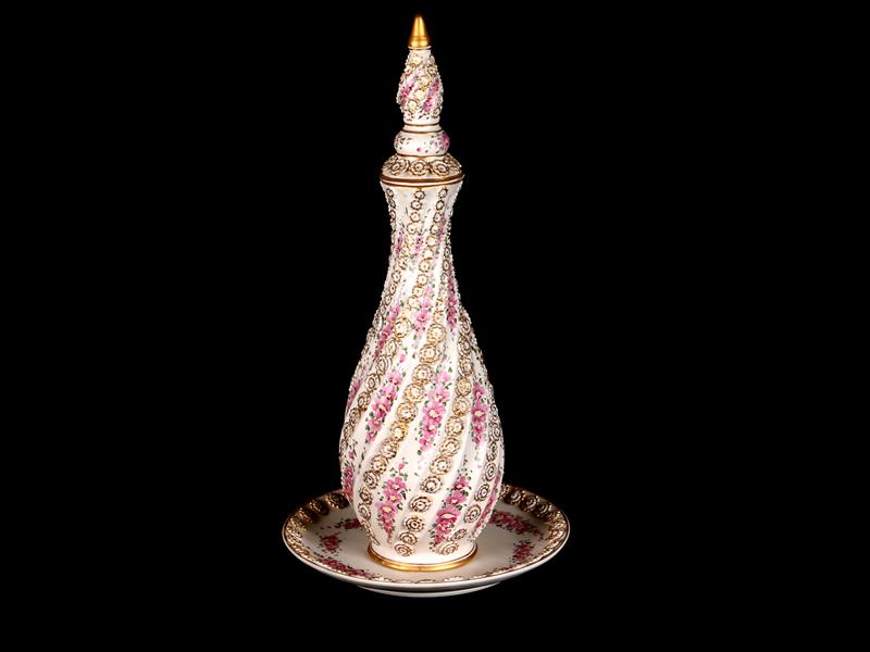 SÜMERBANK İMALAT DAMGALI. RENKLİ ÇİÇEK MOTİFLERİ APLİKELİ, ALTIN YALDIZ DEKORLU. DESEN ÇALIŞAN A.AŞICI. VAZO H 47 CM. TABAK ÇAP 25 CM.