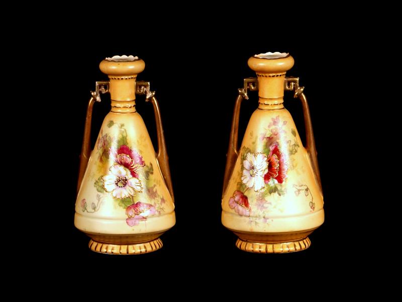 AVUSTURYA. ALEXANDRA PORCELAIN WORKS İMALAT DAMGALI. ÇİFT TUTAMAKLI, HUNİ FORMLU GÖVDE ÜZERİ, RENKLİ ÇİÇEKLERLE ALTIN YALDIZ EL DEKORLU. H 16,5 CM.