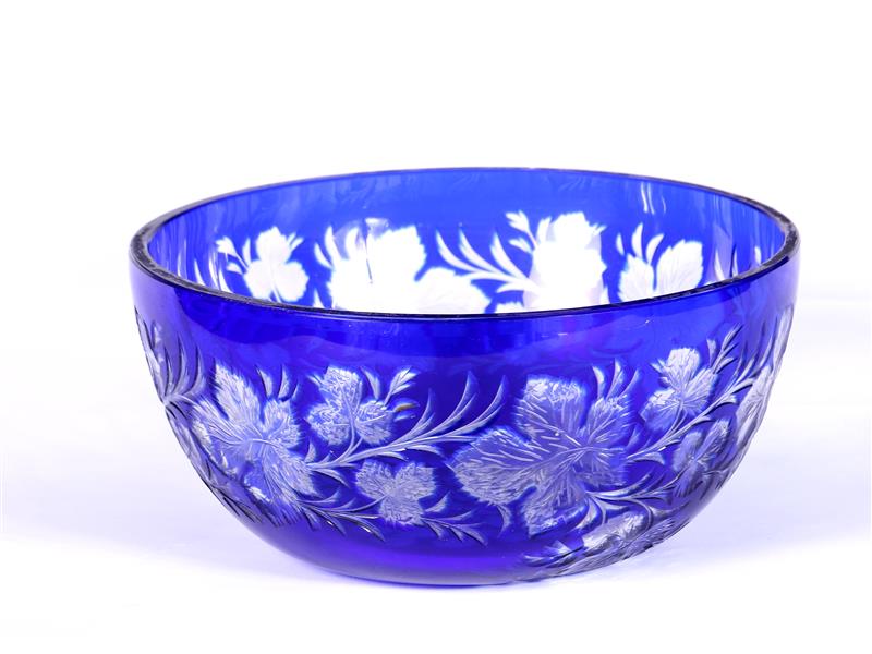 KOBALT RENKLİ. TÜM GÖVDE OYMA İŞÇİLİKLİ, FLORAL DESENLERLE SÜSLÜ. ÇAP 20 CM. H 9 CM.