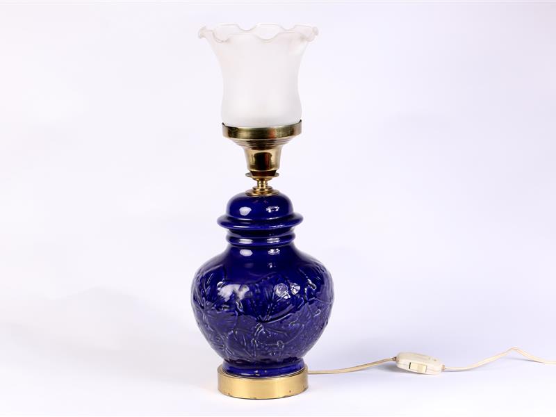 PİRİNÇ KAİDE ÜZERİ KOBALT RENKLİ, UZAKDOĞU FORMLU. KABARTMA DESENLİ. TEK LAMBALI. H 48 CM.