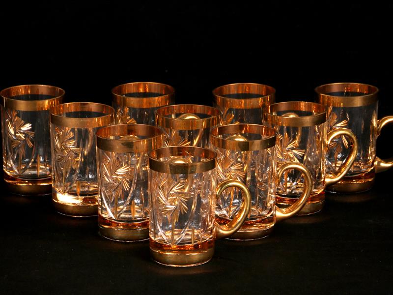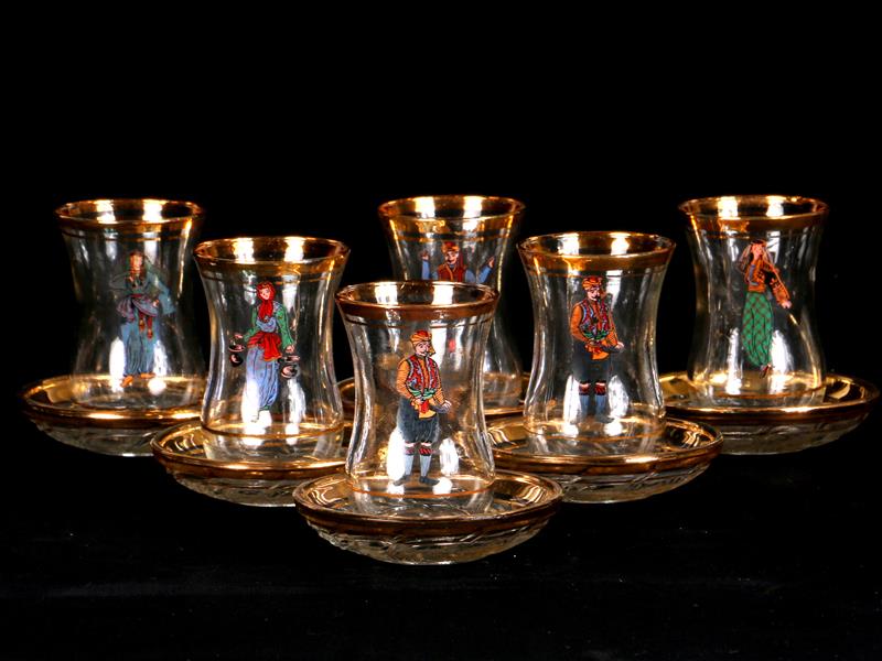 BİLLUR İŞ. BARDAK GÖVDELERİ RENKLİ FİGÜRLERLE, AĞIZ ÇEVRESİ İLE TABAK KENARLARI ALTIN YALDIZ İLE DEKORLU.
