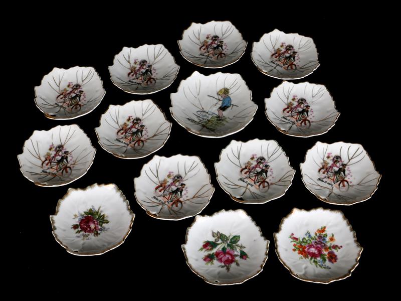 YAPRAK FORMLU, TABAK İÇLERİ ALTIN YALDIZ, MUHTELİF FİGÜRLER VE RENKLİ ÇİÇEKLERLE DEKORLU. ÇAP 10-12 CM.