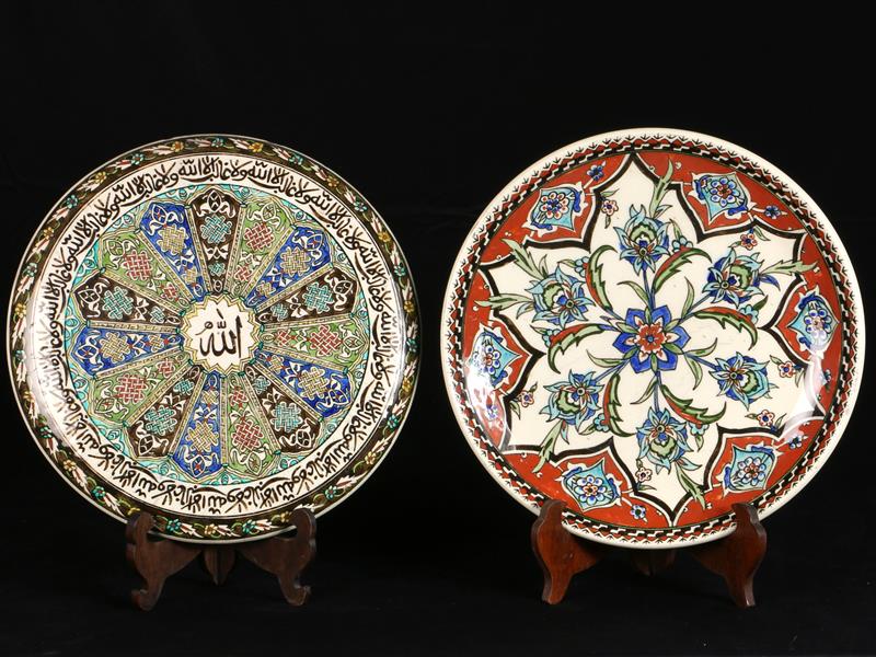 ETRAFINDA VELA GALİBE İLLALLAH (ALLAH TAN BAŞKA GALİP YOKTUR) CÜMLESİ TÜM ÇEVREDE TEKRARLANMIŞ. (YUSUF SURESİ 21. AYETİNDE YER ALIR) ORTA KISIM İSE MUHTELİF RENKLİ DESENLERLE DEKORLU ÇAP 31 CM. İKİNCİ TABAK, TÜM YÜZEY ÇİÇEKLER VE DESENLERLE DEKORLU. ÇAP 31 CM.
