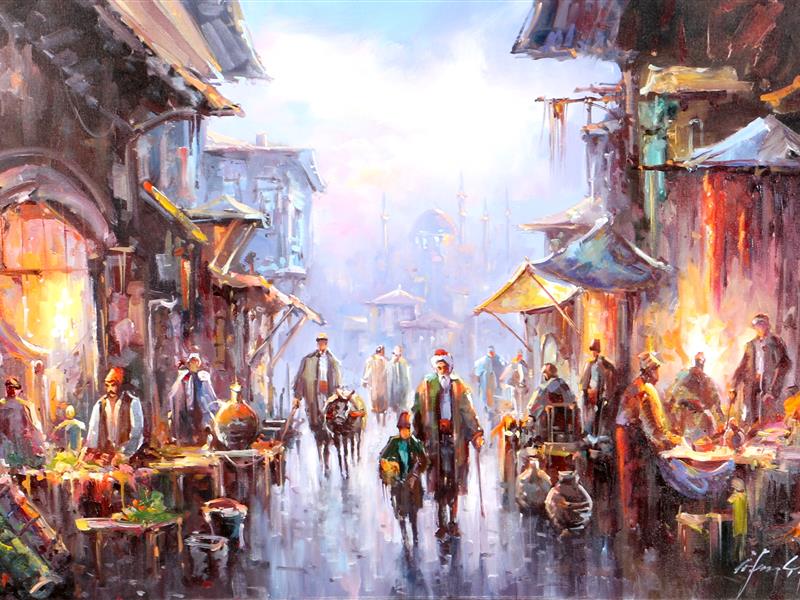 ESKİ İSTANBUL DA PAZAR YERİ GÖRÜNÜMÜ. TUAL ÜZERİ YAĞLIBOYA. İMZALI. 60X90 CM.
