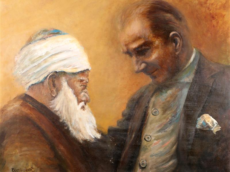 HALKI DİNLEYEN ATATÜRK. TUAL ÜZERİ YAĞLIBOYA. İMZALI. 1996 T. 95X110 CM.