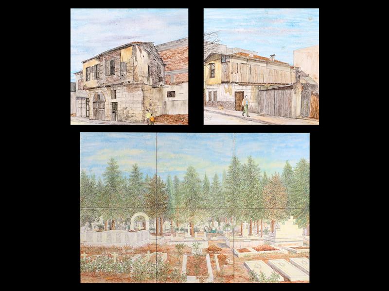 KÖY EVİ. SERAMİK ÜZERİ YAĞLIBOYA. İMZALI. 1997 T. 33X33 CM. MERSİN DE BULUNAN 3 FARKLI DİNE AİT MEZARLIK. SERAMİK ÜZERİ YAĞLIBOYA. İMZALI. 1997 T. 66X99 CM. ESKİ EV. SERAMİK ÜZERİ YAĞLIBOYA İMZALI. 1997 T. 33X33 CM.