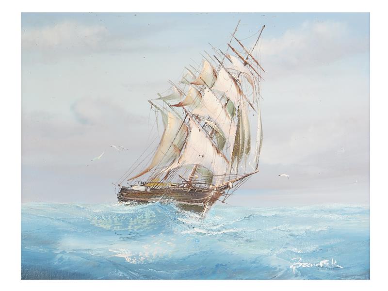 DALGALI DENİZDE KALYON. TUAL ÜZERİ YAĞLIBOYA. İMZALI. 30X40 CM.