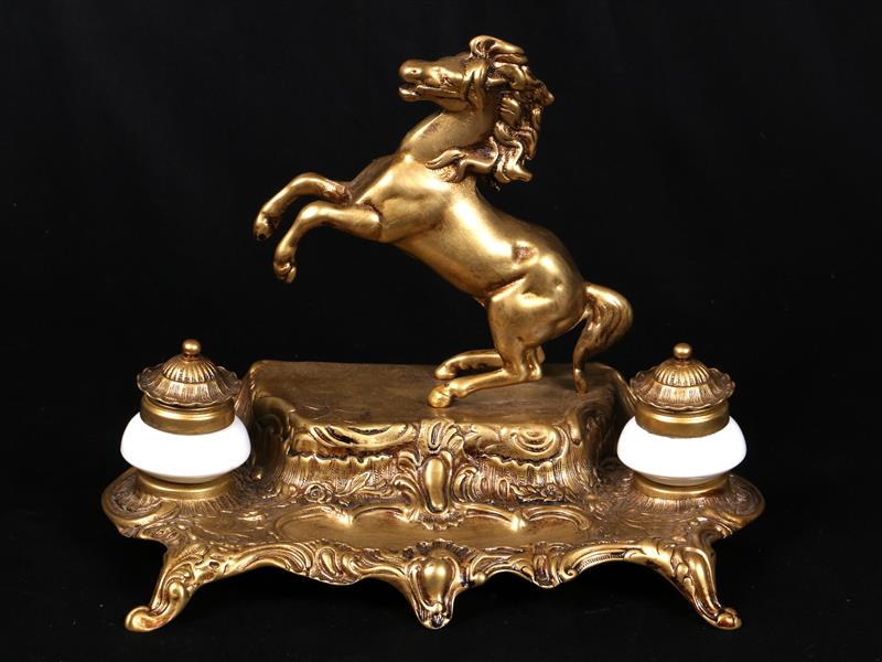 A.MOSSO İMZALI. ŞAHLANMUŞ AT HEYKELİ APLİKELİ. MUHTELİF KABARTMA DESENLERLE DEKORLU. ÇİFT PORSELEN VE CAM MÜREKKEP HAZNELİ. 30X18 CM. H 23 CM.