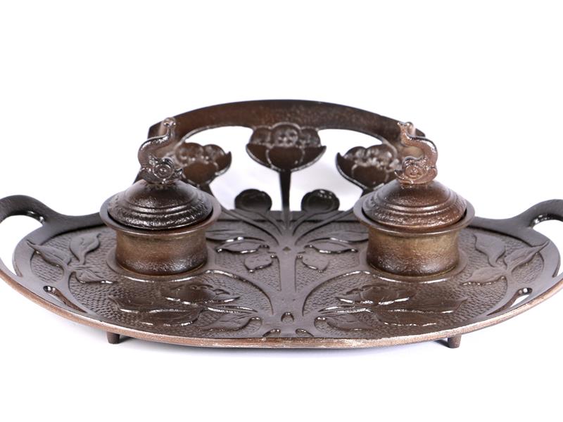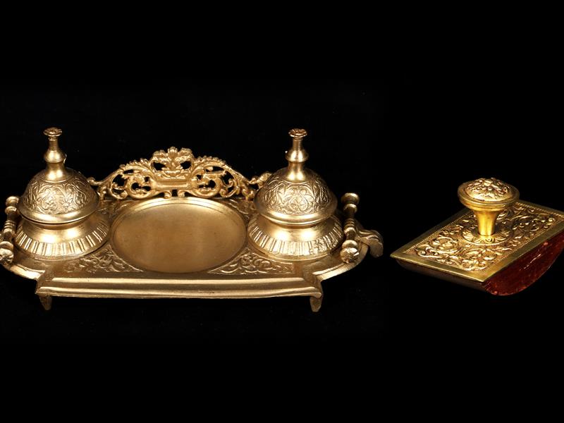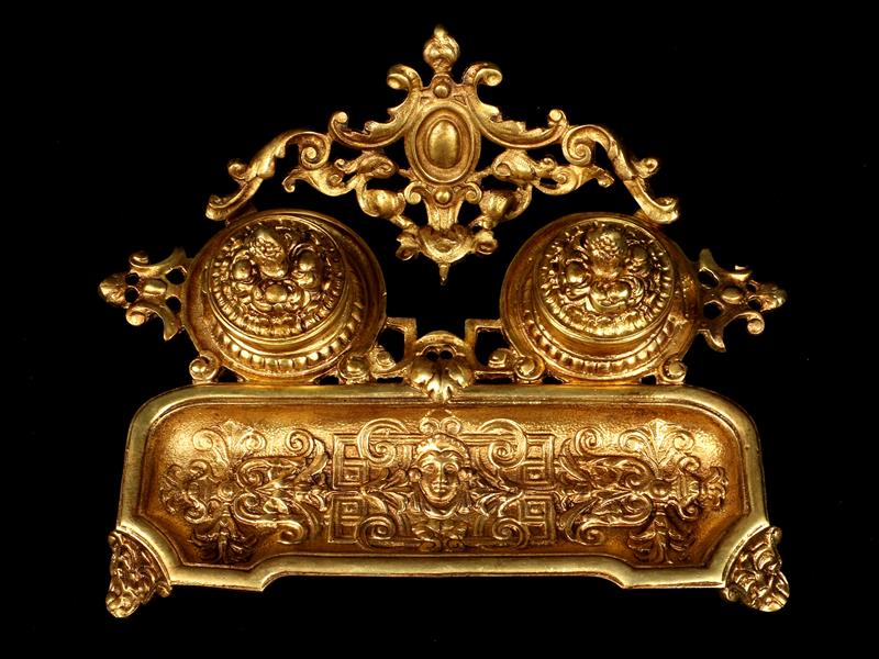 ALTIN VERMEYLİ. KABARTMA FİGÜR VE MOTİFLERLE DEKORLU. ÇİFT CAM MÜREKKEP HAZNELİ. 25X20 CM.