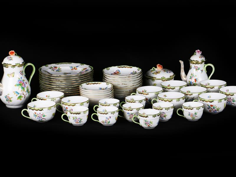 MACAR. HEREND İMALAT DAMGALI. TÜM GÖVDELER RENKLİ ÇİÇEK, KELEBEK VE ALTIN YALDIZ EL DEKORLU. 8 ADET KAHVE FİNCANI VE TABAĞI, 10 ADET ORTABOY FİNCAN VE TABAĞI, 12 ADET TATLI TABAĞI, DEMLİK, SÜTLÜK VE ŞEKERLİK. TOPLAM 51 PARÇA. ÇOK ÖZEL KOLEKSİYONLUK BİR TAKIM.