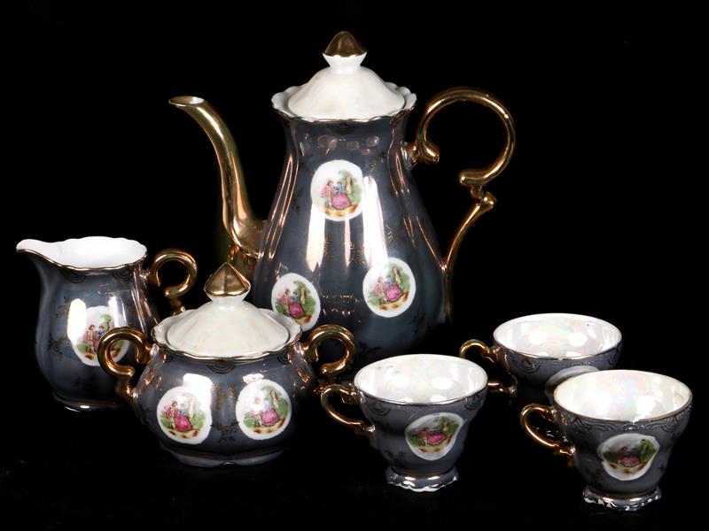 İMALAT DAMGALI. 3 FİNCAN, DEMLİK, SÜTLÜK VE ŞEKERLİK. MUHTELİF FİGÜRLERLE DEKORLU. ÇAYDANLIK UCU VE TUTAMAKLAR ALTIN YALDIZ SIVAMA KAPLI.