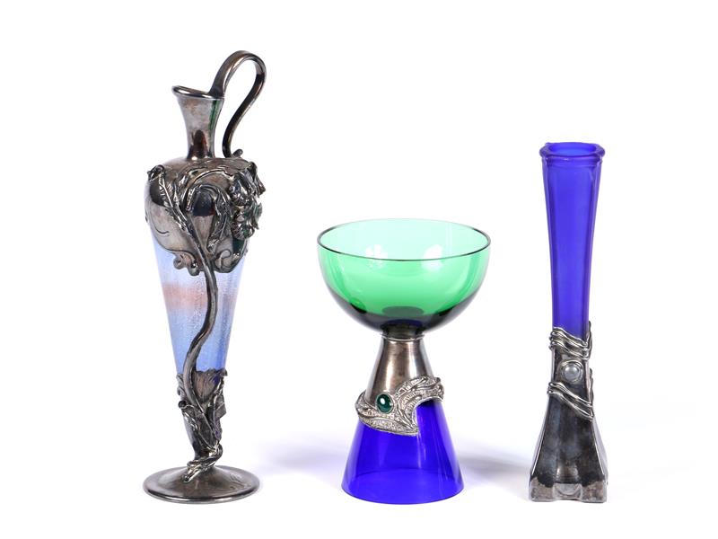 VAZO, ROTEM İMALAT DAMGALI. COBALT RENKLİ. ALT KISMI GÜMÜŞ SIVAMA KAPLI. H 20 CM. ŞEKERLİK YEŞİL VE COBALT RENKLİ, ORTA KISIM GÜMÜŞ GEÇMELİ. H 14,5 CM ÇAP 10 CM. KARAF, COBALT ÜZERİ GÜMÜŞ SIVAMA KAPLI. H 24 CM.