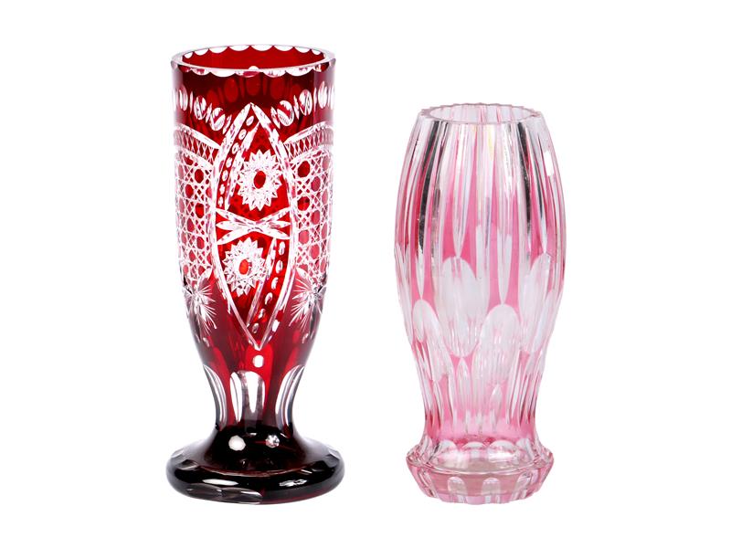 KESME KRİSTAL. BORDO RENKLİ. H 29,5 CM. ÇAP 11 CM. PEMBE RENKLİ. H 26 CM. ÇAP 8 CM.