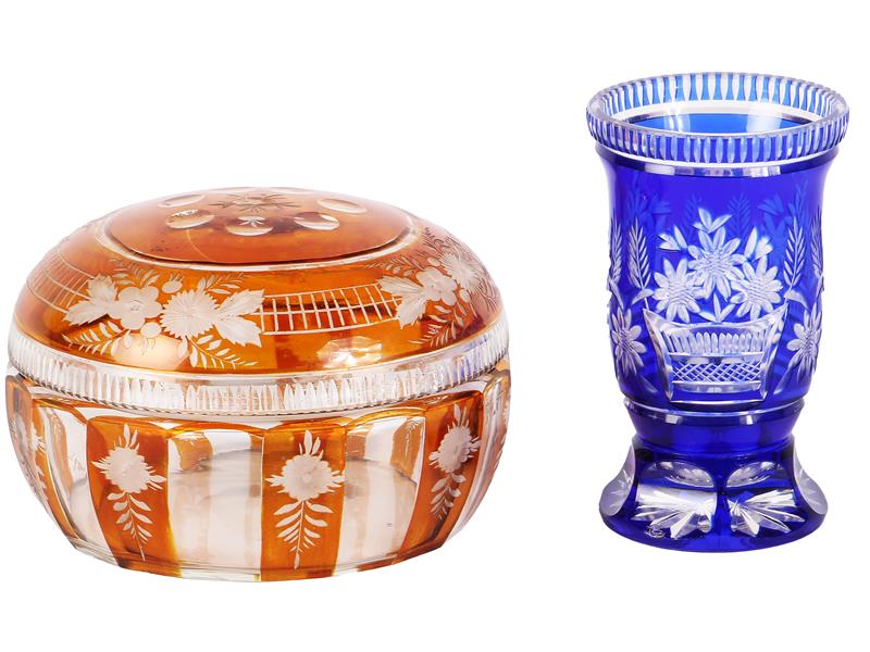 VAZO KOBALT RENKLİ. KESME İŞÇİLİKLİ. ÇİÇEKLERLE DEKORLU. H 12,5 CM. ÇAP 7,5 CM. TABA RENKLİ. YUVARLAK FORMLU, BOMBE KAPAKLI. TÜM GÖVDE KESME İŞÇİLİKLİ ÇİÇEKLERLE DEKORLU. H 9 CM. ÇAP 13,5 CM.