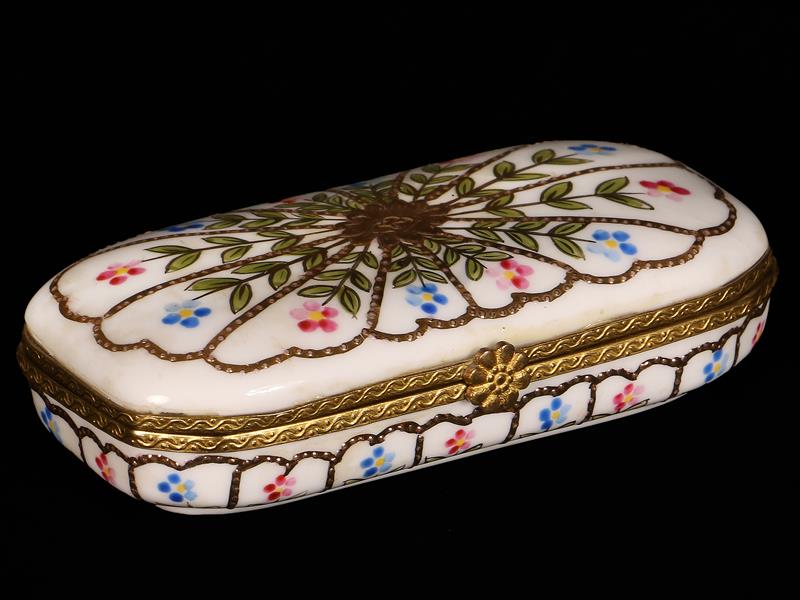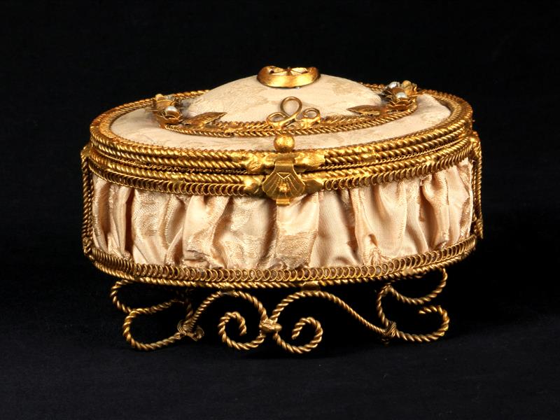 OVAL FORMLU. TÜM GÖVDE PİRİNÇ BURMA İŞÇİLİKLE BAĞLANTILI. PİLELİ KREM RENKLİ SATEN KUMAŞ KAPLI. KAPAK ÜZERİ İNCİLERLE SÜSLÜ ZARİF ÇİÇEKLER VE ORTADA AY YILDIZ APLİKELİ. 15X8,5X13 CM.