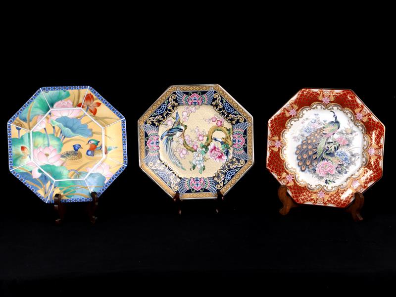 UZAK DOĞU. SEKİZGEN FORMLU. ÇOK RENKLİ HAYVAN VE RENKLİ ÇİÇEKLERLE DEKORLU. 1 ADEDİ TOZAN JAPAN İMALAT DAMGALI. 26,5X26,5 CM.