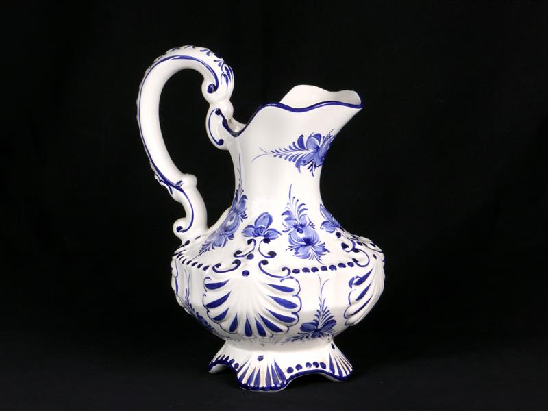 BEYAZ HAMURLU, ŞİŞKİN GÖVDELİ. GAGA AĞIZLI. KIVRIK TUTAMAKLI TÜM YÜZEY KOBALT RENKLİ ÇİÇEKLERLE VE MOTİFLERLE DEKORLU. H 33 CM.
