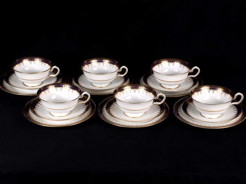 İNGİLİZ. SPODE COPELANDS CHINA İMALAT DAMGALI. 6 ADET 3 LÜ PORSELEN FİNCAN VE TABAKLARI. FİNCAN VE TABAKLARIN KENARLARI KOBALT RENK ÜZERİ ALTIN YALDIZ DEKORLU.