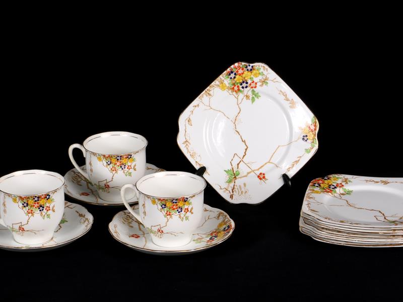 İNGİLİZ. SUMMER BLOSSOM İMALAT DAMGALI. FİNCAN VE TABAK ÇEVRELERİ ALTIN YALDIZ BORDÜRLÜ. 3 ADET FİNCAN VE TABAĞI. 6 ADET PASTA TABAĞI.