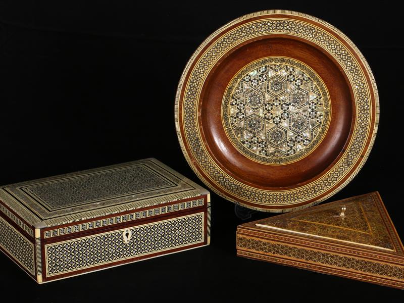 İRAN. YUVARLAK FORMLU TABAK AHŞAP ÜZERİ SEDEF KAKMALI. ÇAP 31 CM. MÜCEVHER KUTUSU DİKDÖRTGEN FORMLU SEDEF KAKMA. 27X8,5X18,5 CM. ÜÇGEN FORMLU MÜCEVHER KUTUSU 26X5X26 CM.