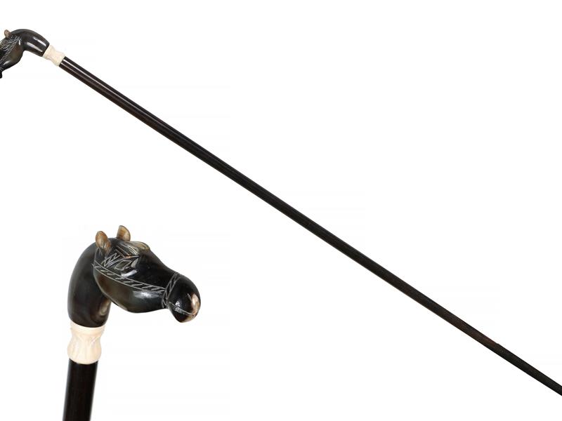 GÖVDE ABANOZ AĞACINDAN MAMÜL. TUTAMAK BUFALO BOYNUZUNDAN AT BAŞI FORMLU. KEMİK ARA PARÇALI. UZ. 99 CM.