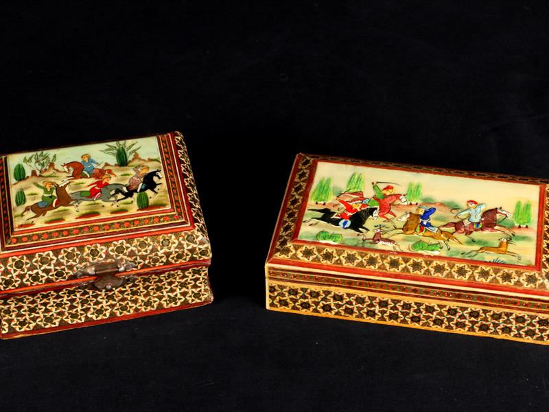 İRAN. DİKDÖRTGEN FORMLU KAPAK ÜSTÜ MİNYATÜR ÇALIŞMALI. 16X8X10,5 - 12X6X11 CM.
