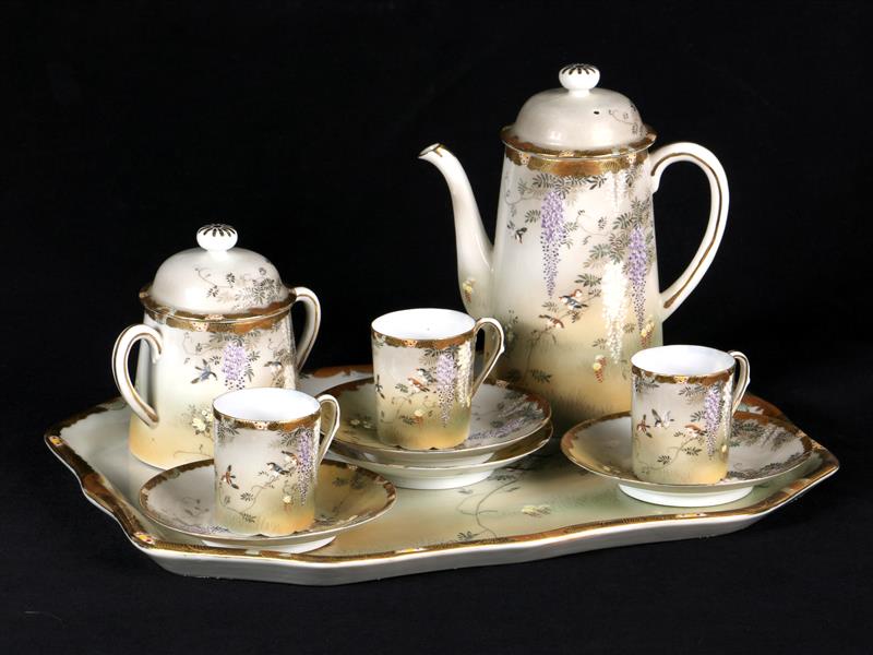 UZAK DOĞU İMALAT DAMGALI. 3 FİNCAN VE TABAĞI, DEMLİK, ŞEKERLİK VE TEPSİ. ÇOK İNCE HAMURLU. TÜM GÖVDE ÜZERLERİ BİTKİSEL VE HAYVAN FİGÜRLERİ İLE EL DEKORLU. TEPSİ 35X27 CM.
